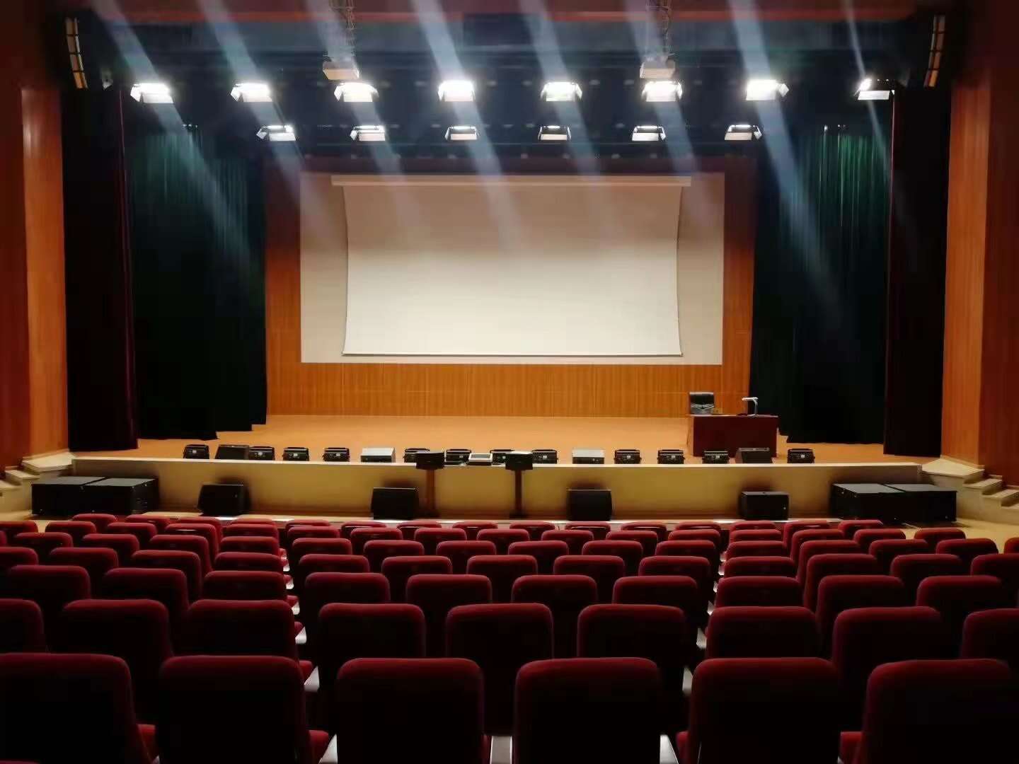 1. 防火幕:防火幕緊貼臺口;一般超過1200坐,要求必須設計防火幕;2. 前沿幕(徽標):防火幕以后,間隔300mm左右;若沒有防火幕緊靠臺口200-300mm;3. 對開大幕: